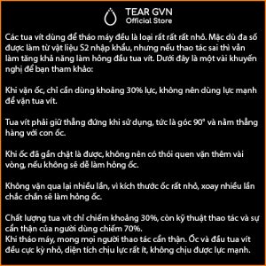 Lưu ý: từ (3/2026) shop ngừng bán mẫu tua vít cũ giá rẻ được làm bằng thép 45 thường, chất liệu chưa qua xử lý nên khi dùng dễ mòn đầu vít cũng như mòn các đầu ốc nhỏ.