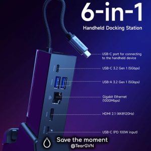 -Dock HDMI HB0609 mới nhất từ JSAUX. Trải nghiệm chơi game nâng cao với đầu ra HDMI 4K@120Hz, Gigabit LAN Ethernet, sạc USB-C PD, USB-C 3.2 Gen 1 và hai cổng USB-A 3.2 Gen 1.