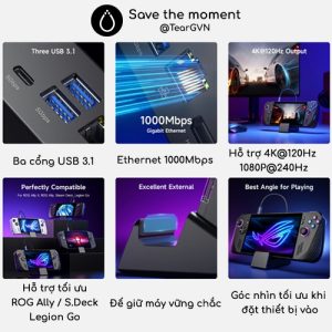 *Lưu ý: khi ROG Xbox Ally / ROG Xbox Ally X / ROG Ally / ROG Ally X được kết nối với dock, một phần công suất đầu vào sẽ được dock tiêu thụ. Nếu sử dụng bộ sạc PD 65W chính hãng hoặc công suất thấp hơn, có thể xuất hiện thông báo “Not enough power to charge efficiently” (Không đủ công suất để sạc hiệu quả). Điều này không ảnh hưởng đến việc chơi game, nhưng tốc độ sạc sẽ chậm hơn và thời gian sạc tổng thể sẽ lâu hơn. Dock chỉ hỗ trợ chế độ Turbo 30W khi dùng sạc 100W. Khi sử dụng sạc 100W hiện dấu chấm than đó là điều bình thường, hãng xác nhận không ảnh hưởng khi sử dụng.