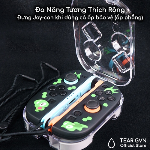 -Tương thích với Joycon khi gắn Strap. Tương thích khi dùng nút bọc Joystick. Hộp đựng vẫn vừa, không bị cấn.